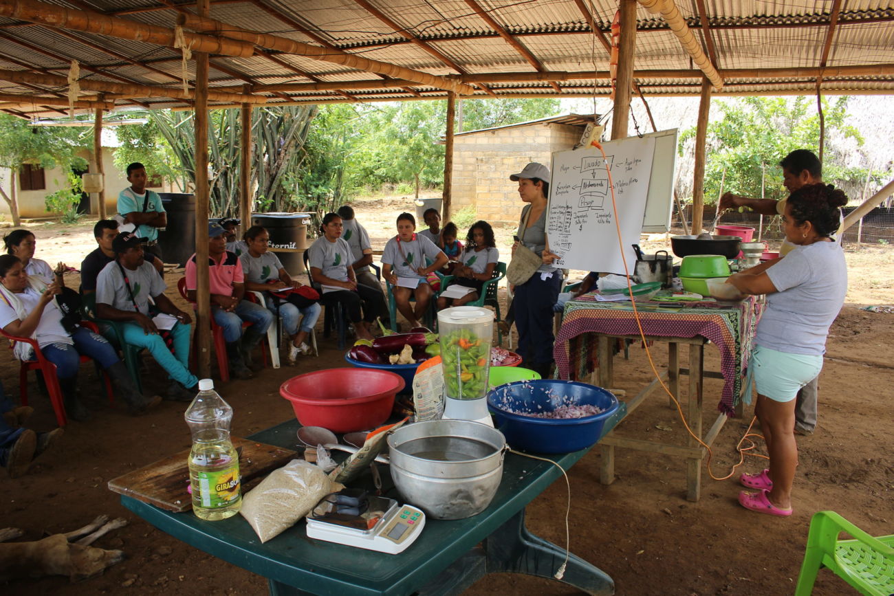 El objetivo de esos talleres es permitir a las comunidades campesinas desenvolverse económicamente y lograr mas autonomía alimentar a través del conocimiento de nuevas formas de valorar las producciones locales. En este caso particular, se hizo junto a los beneficiarios, una salsa de tamarindo (fruta de árbol tropical), unas barras energéticas a base de polvo de Guaimaro (se puede sustituir al café o al cacao por ejemplo y posee gran cantidad de aceite esencial, nutrientes y energías), una conservas de pulpa de mango (hay siempre mucho desperdicio de mango en época de cosecha por falta de saber como conservarlo) y por fin salsa de berenjena. Para poder ir mas allá en la búsqueda de soberanía alimentaria en las comunidades, se están construyendo secadores de semillas para que puedan controlar ellos mismos toda la cadena de productos : cosecha de frutas y semillas, secado de semillas y deshidratación de frutas, transformación según algunas recetas y por fin venta o consumo personal. Se estrenaran esos secadores en algunas semanas con la cosecha de las semillas de Guaimaro que no debería tardar mucho, dando lugar a nuevas posibilidades a los beneficiarios de los Montes de Maria.