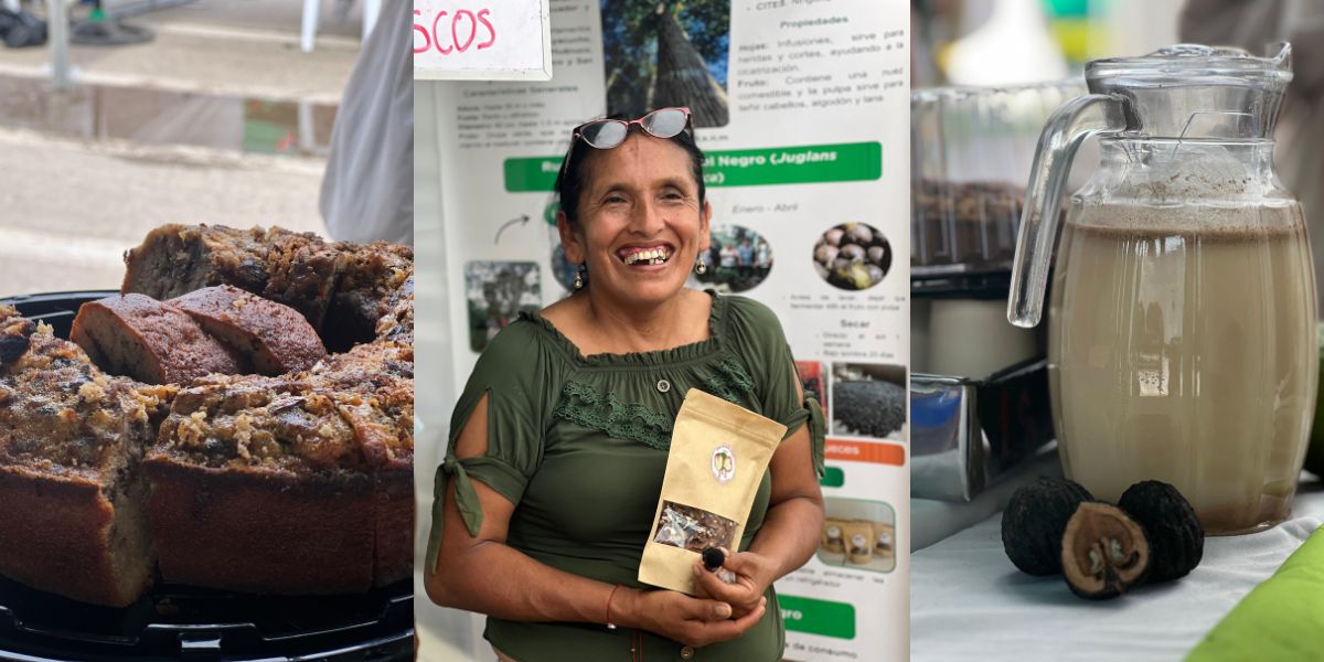2025.08.23 – De izquierda a derecha: kekes elaborados con nogal negro por los productores de Villa Sol ; La señora Lucy presentando la nuez embolsada ; Refresco elaborado con nogal negro por los productores de Villa Sol. © Envol Vert