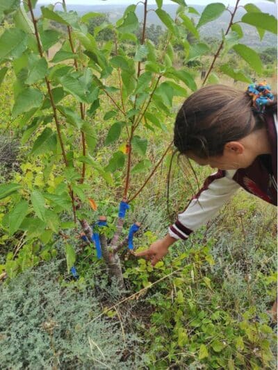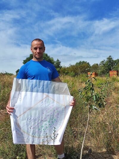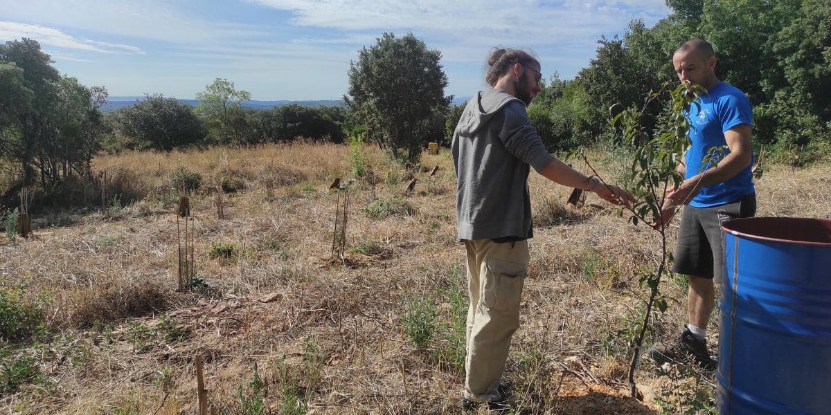 Notre première visite a eu lieu chez Jehan, apiculteur passionné, qui a choisi de planter des arbres pour améliorer le cadre de vie de ses abeilles. Sur son terrain sec et rocailleux, les jeunes plants ont bien repris, même si certaines espèces ont rencontré des difficultés : des pêchers morts après plantation ou encore des amandiers qui n’ont pas repris. Les chiens ont également endommagé quelques frênes et le paillage a causé de légères brûlures sur certains troncs. Malgré ces obstacles, la plantation commence à structurer l’espace, à créer de l’ombre et à améliorer la résilience de la parcelle. Ensemble, nous avons discuté des prochaines étapes, comme l’ajout de nouvelles essences mieux adaptées à ses conditions locales et la protection de jeunes plants contre le soleil et les herbivores.